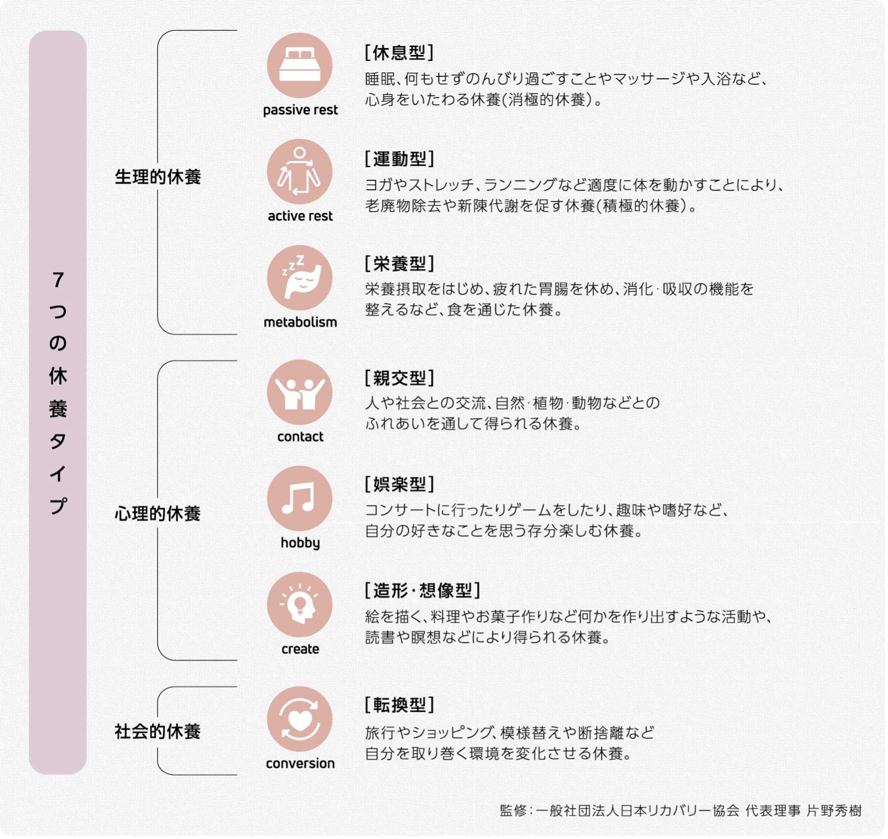 そこで休養学では大きく「生理的休養」「心理的休養」「社会的休養」の3つに分類し、そこからさらに7つのタイプに分類しています。自身の嗜好や気分に合わせ、7つのタイプをうまく組み合わせて、心身ともにリフレッシュすることが大切になります。
