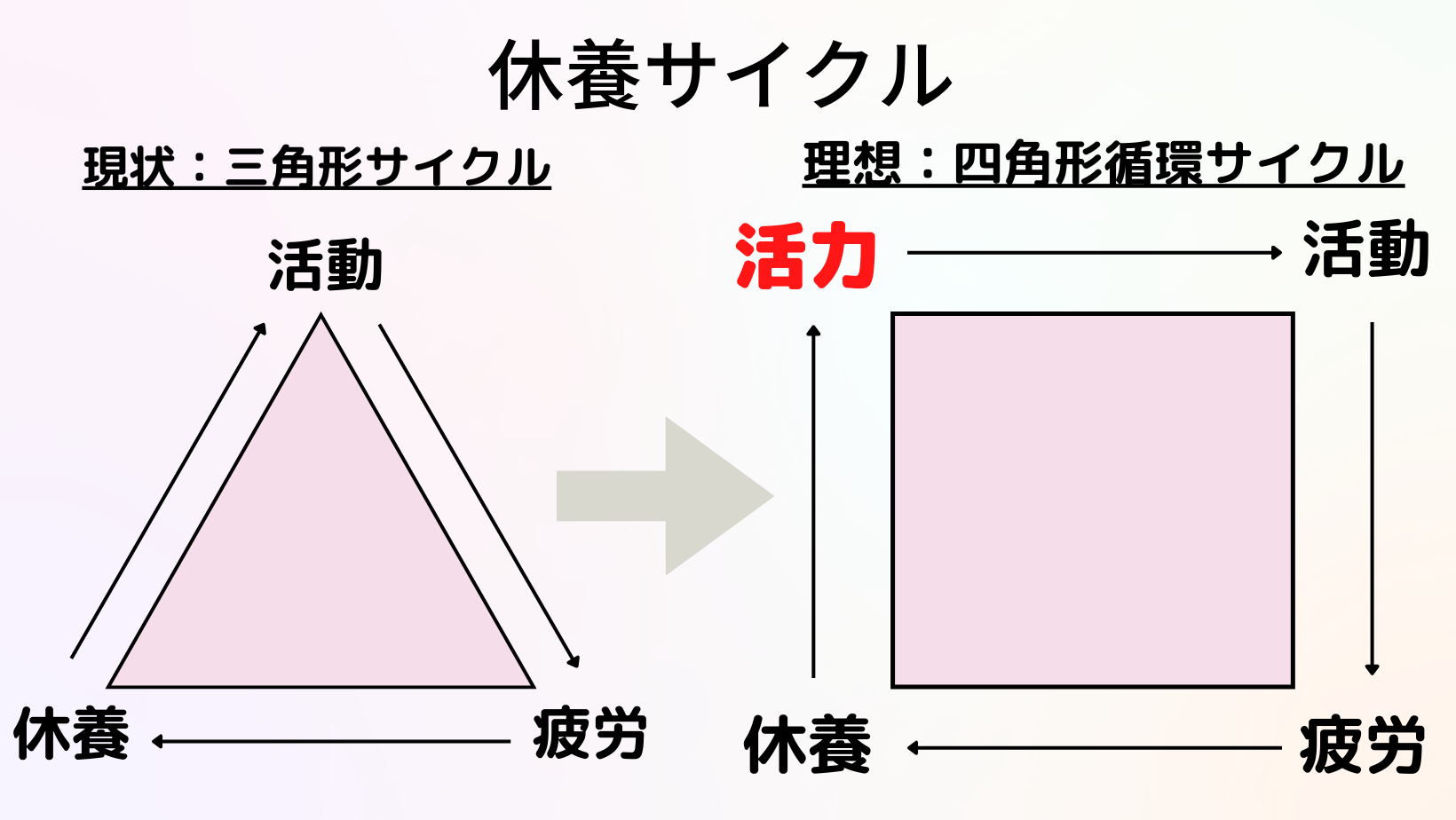 しかし、DXなどの技術や情報通信の発展などで効率重視になった現代では、社会のスピードは格段に速くなりました。時代が変わっているのにも関わらず、休み方がそのままでは回復も追いつきません。次の活動に必要な活力を高めることこそが、今すべての人が意識すべきことです。